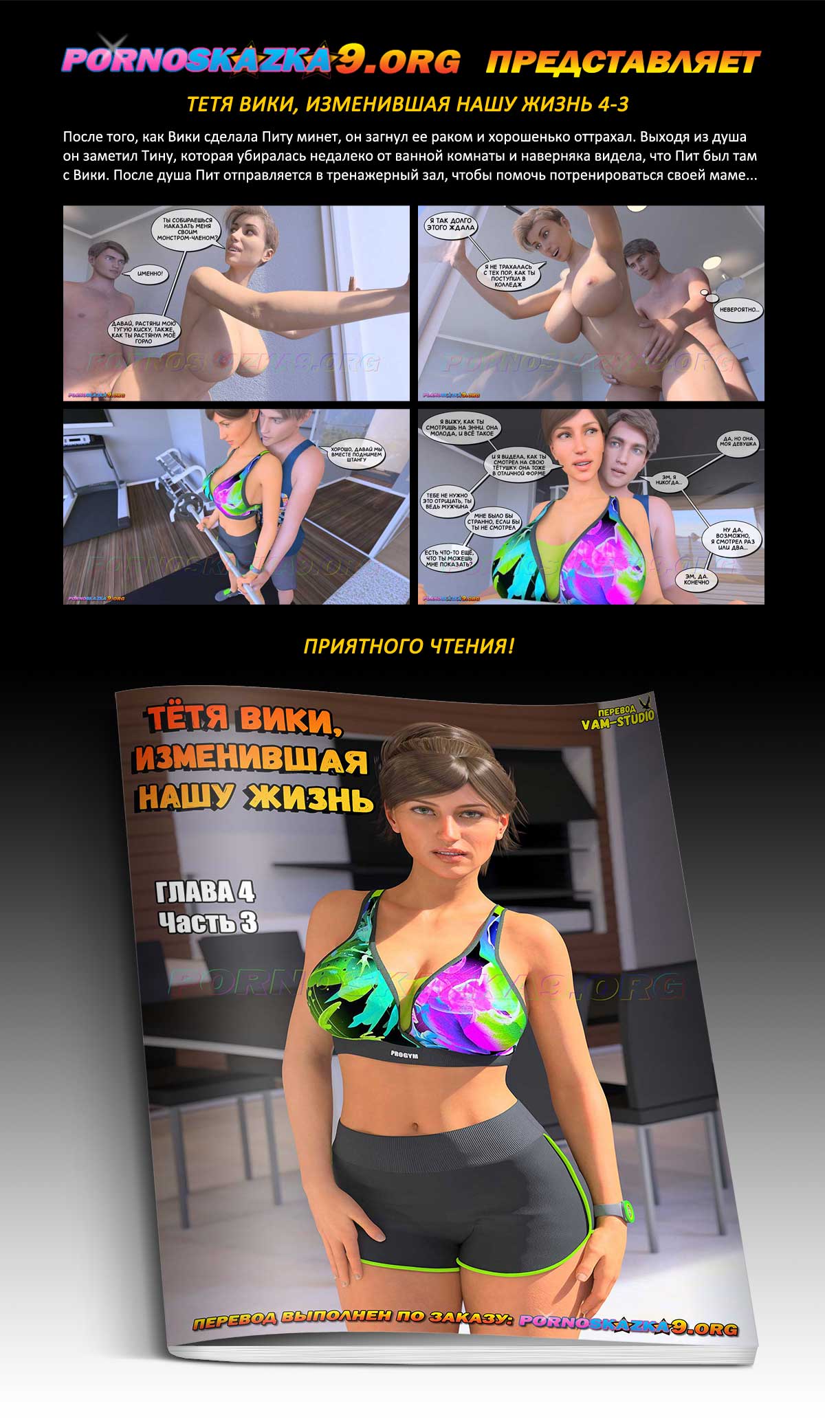 Порно комикс «Тетя Вики, изменившая нашу жизнь. Глава 4. Часть 3.» После того, как Вики сделала Питу минет, он загнул ее раком и хорошенько оттрахал. Выходя из душа он заметил Тину, которая убиралась недалеко от ванной комнаты и наверняка видела, что Пит был там с Вики. После душа Пит отправляется в тренажерный зал, чтобы помочь потренироваться своей маме…